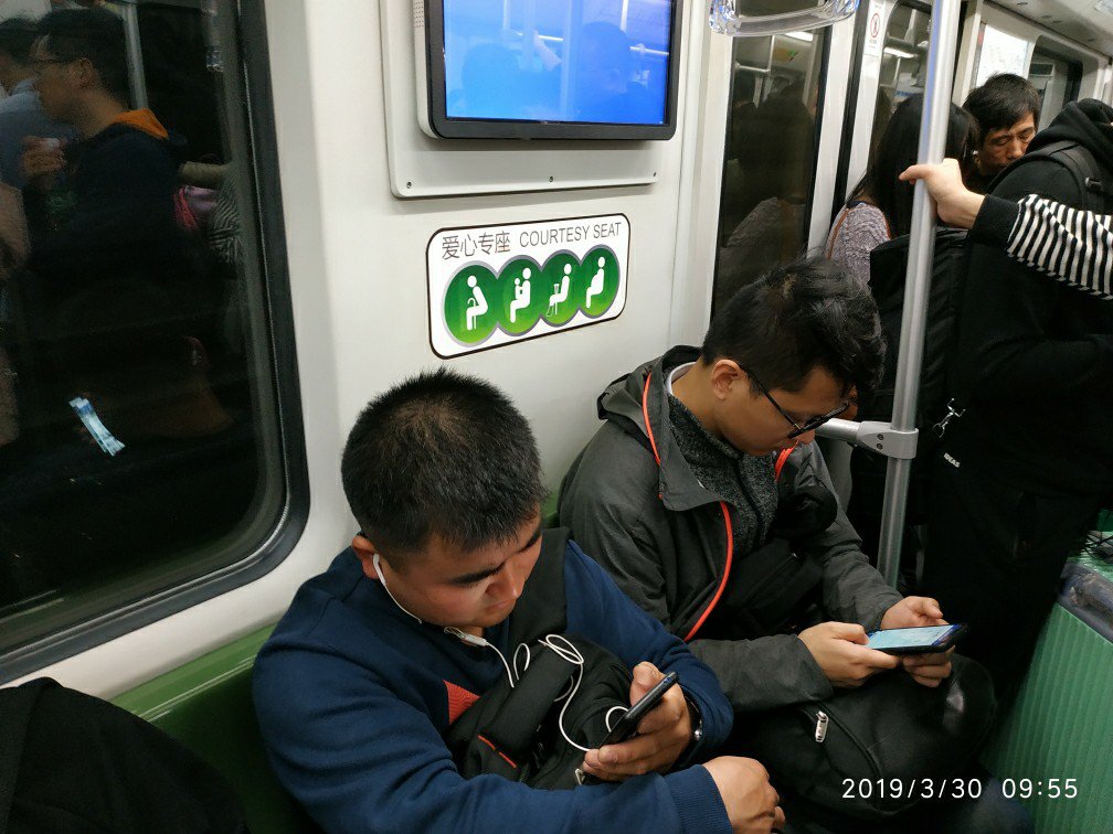 從虹橋站轉四號線環狀線,連結十號線的穿堂超過一佰公尺,都是蘋果手機廣告牆。從此站至上海體育館轉一號線往莘莊,三四號線共站,辣妹出沒,小心搭錯車。愛心專座只是個示意圖,別當真。
